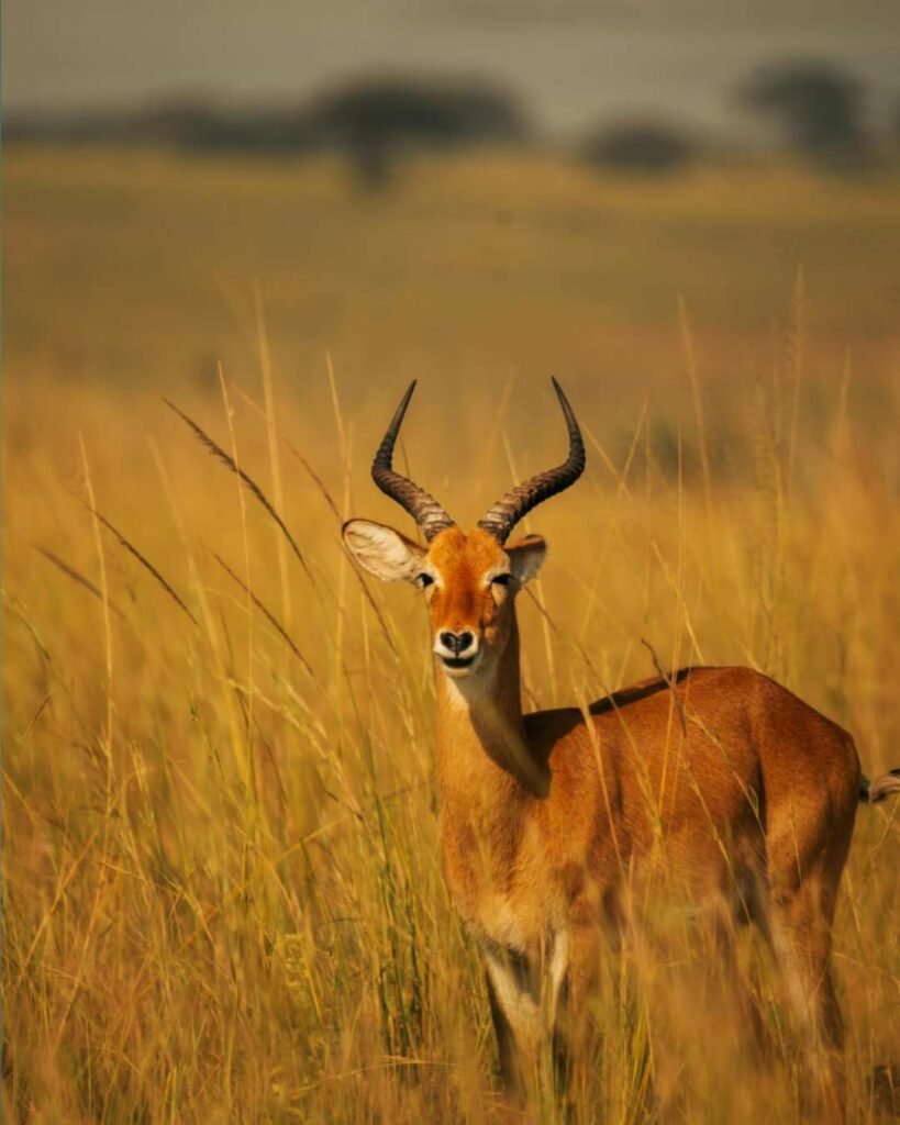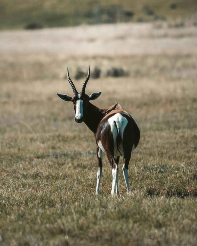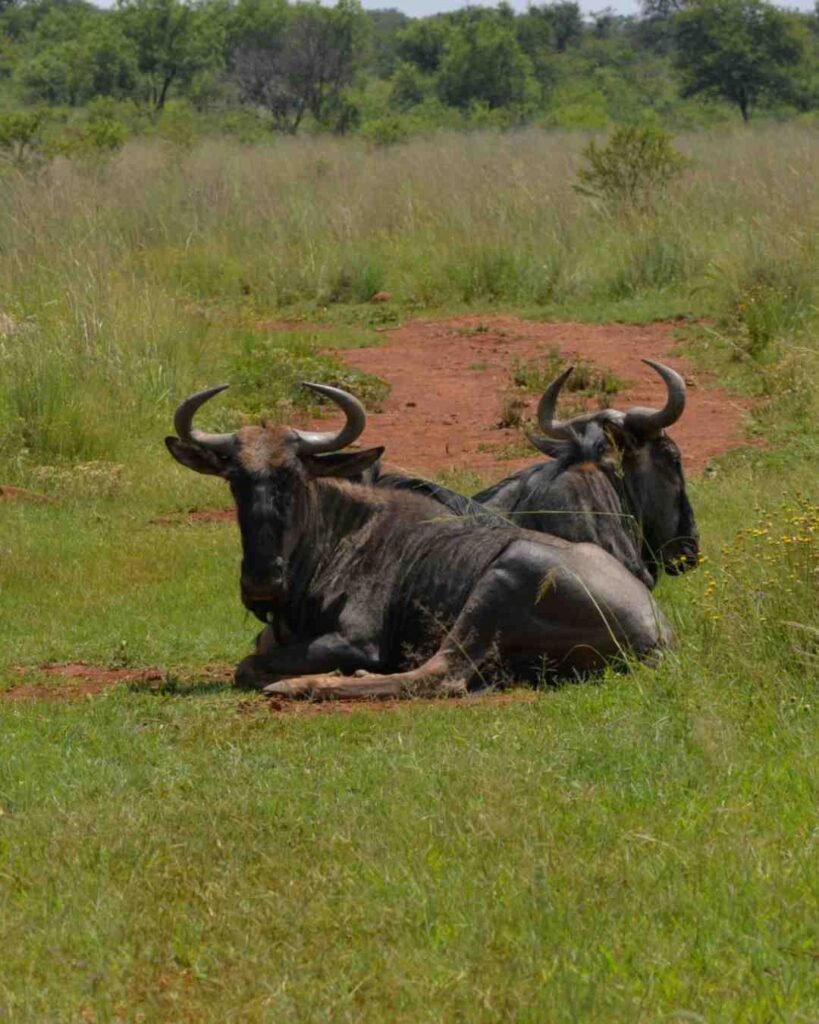 The blue wildebeest is a species of antelope with two horns on its head and four legs. It can reach a top speed of 80 km/h and has a lifespan of up to 20 years.